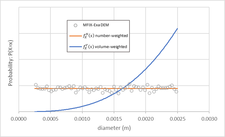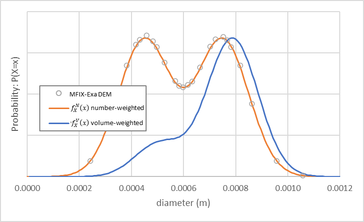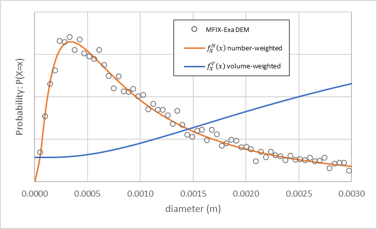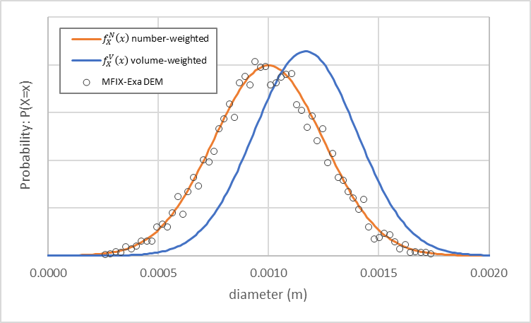 An MFIX-Exa DEM simulation with these settings generates approximately 81,700 particles. The particle size distribution is shown in Fig. 10 (open circles) in addition to the number-weighted (orange) and volume-weighted (blue) density functions. As noted by Weiner [Wei11], the volume-weighted probability density function (PDF) is shifted to the right of the number-weighted PDF.
