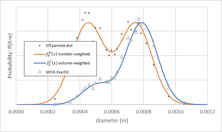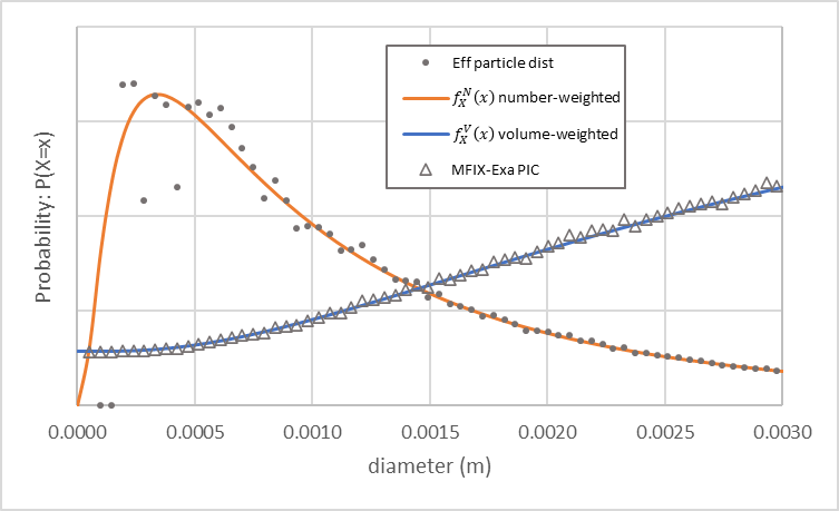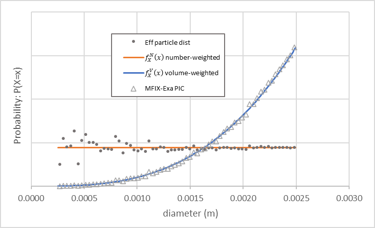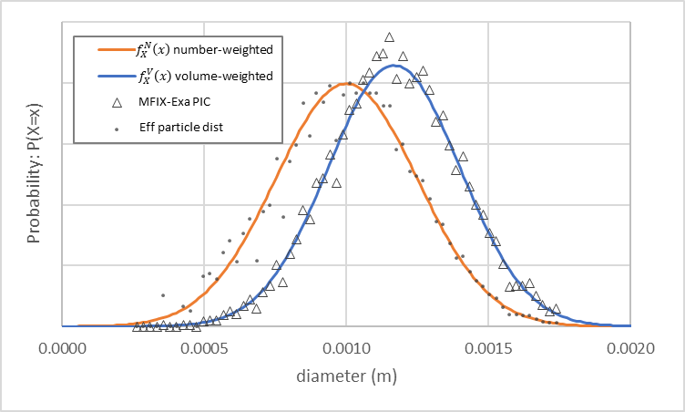 Fig. 11 MFIX-Exa PIC parcel size distribution (open triangles) generated from example inputs. The number-weighted density function (orange) with 1 mm mean and 0.25 mm standard deviation, and volume-weighted density function (blue) with ~1.17 mm mean and ~0.23 mm standard deviation are also plotted.