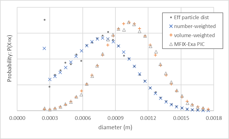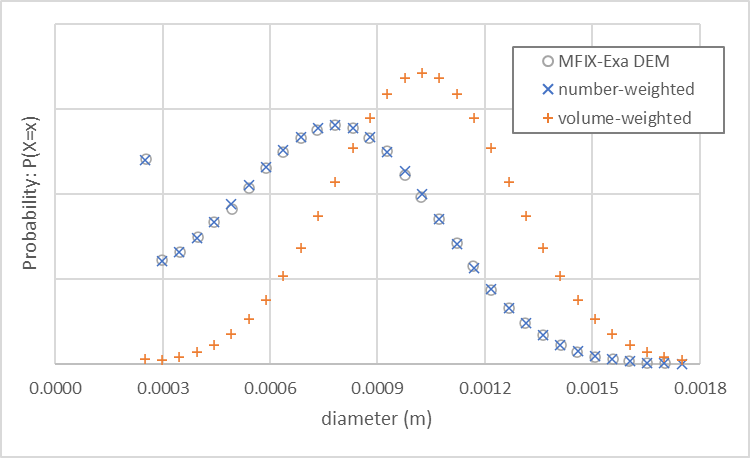 An MFIX-Exa DEM simulation with these settings generates approximately 963,000 particles. The particle size distribution (open circles), and number-weighted (orange plus), and volume-weighted (blue cross) probabilities are shown in Fig. 19.