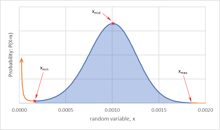 Fig. 12 The number-weighted normal distribution function approximated by dividing the volume-weighted distribution function by x3. The approximate mean and variance are computed by numerically integrating this function from xmin to xmax.