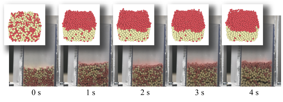 Fig. 26 Comparison of experiment and MFIX-Exa simulaton for rapid segregation of a bidisperse particle mixture.