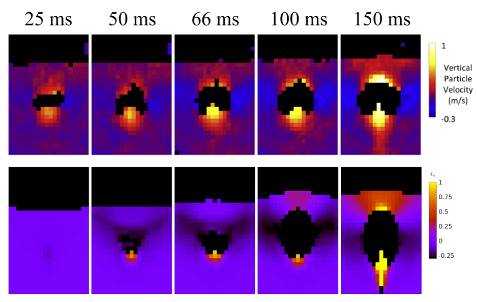 The figure above provides a comparison between MFIX-Exa 19.08 simulation results and the experimental measurements. In both cases, the particle data has been averaged onto a \(10\) mm thick grid of \(21 \times 32\) For the longer injection times, \(\delta t_{inj} \approx 100\) and \(150\) ms, the simulated bubbles are larger and more elongated than observed experimentally. However, this trend is not universal, at shorter injection times, the bubble is too small and actually collapses before erupting at the surface. Above, the bubble produced from a \(50\) ms injection is currently in the process of collapsing. Another interesting feature (perhaps most apparent at \(66\) ms), is the V-shaped region of particle down flow centered around the bubble centeroid, which appears to be captured rather well by the simulation.