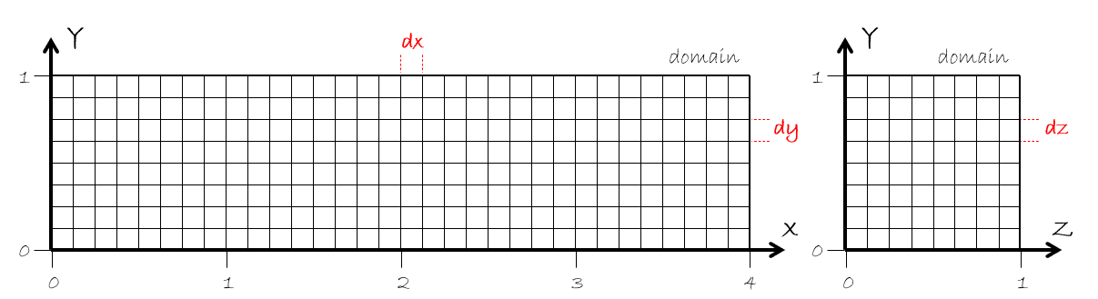 The base mesh spacing is computed for each direction by dividing the domain length by the number of cells. The mesh spacing is required to be the same in all directions: