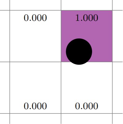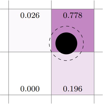 The centroid deposition scheme transfers particle properties, for example volume, to the Eulerian grid cell containing its center. Illustrated in two-dimensions below, the particle center is in the upper-right cell; therefore, the deposition weight for that cell is 1 and all other weights are zero.