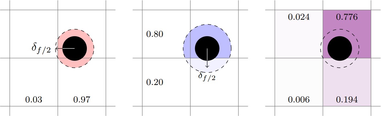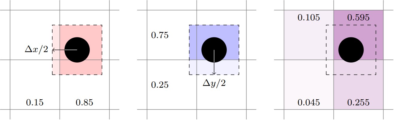 Trilinear deposition transfers particle properties to the eight Eulerian grid cells surrounding its center. First, low and high weights are calculated for each direction, then they are multiplied together to form eight composite weights. The following figure illustrates bilinear interpolation. The left image shows weights computed in the X-direction, \([0.15, 0.85]\), and the center image shows weights computed in the Y-direction, \([0.25,0.75]\). The right image shows the composite weights for the four cells that comprise the 2D neighborhood surrounding the particle.